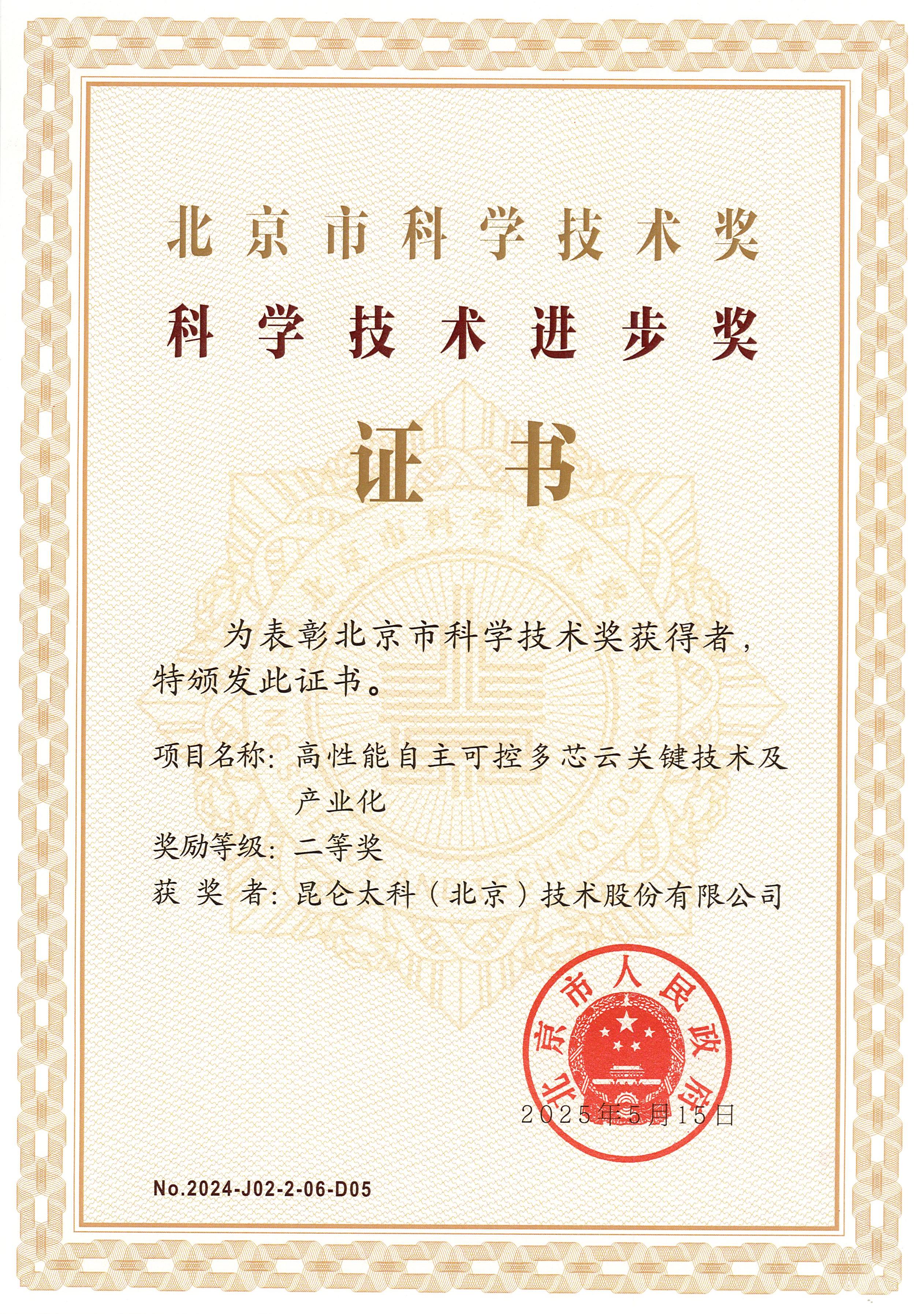 2025 年 11 月 7 日,“2024 年度北京市科学技术奖励大会” 在北京会议中心隆重召开。昆仑太科作为核心参与单位,与牵头单位太极计算机股份有限公司、北京航空航天大学、北京首信科技股份有限公司等深度协同,联合申报的《高性能自主可控多芯云关键技术及产业化》项目荣获北京市科学技术进步奖二等奖!